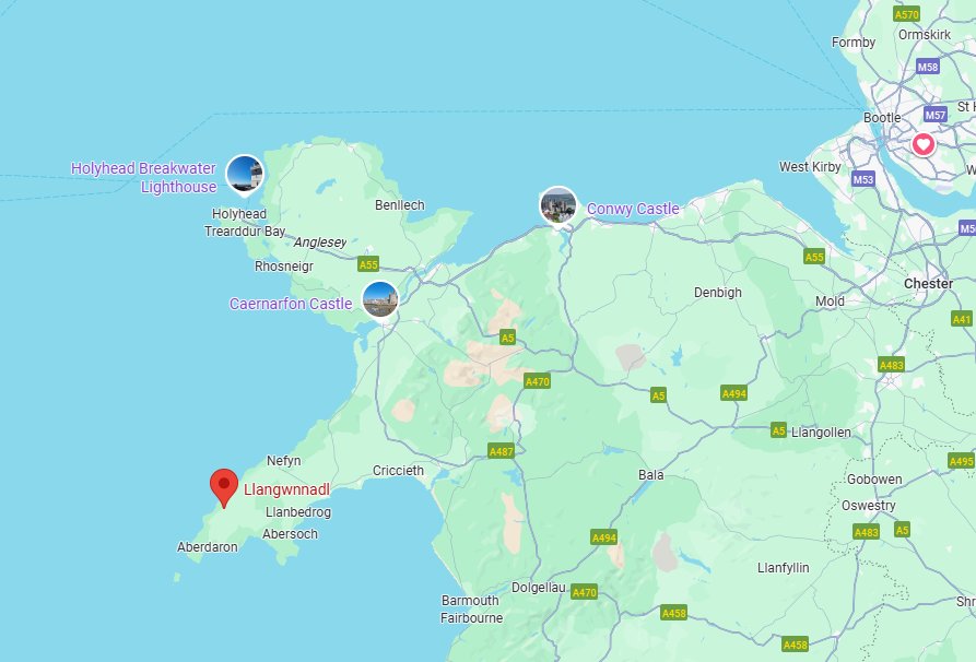 *I’ve used the Anglicised spellings that were current at the time. It’s now Llŷn (not even the English “peninsula” seems to be used) and the correct Welsh placenames you can easily find on Google maps if you’re so inclined.